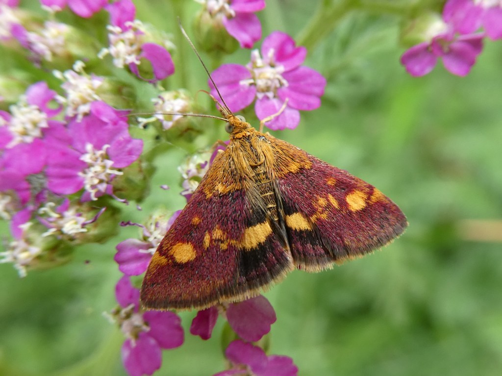 An early morning walk a couple of days ago disturbed two muntjac, who went off in different directions barking very loudly for several minutes. In heat and full sun today, everything is beginning to look a bit autumnal, with leaves falling, blackberries nearly over and as last summer, the pond completely dried out again. In the river were lots of fish, both minnows and also larger fish up to about 30cm. I spent some time looking for the Musk Beetle (3cm, iridescent green, with long antennae) but without success. It needs willows for its larvae to feed on and has been recorded here in the past, though is rare generally. Please let me know if you see one. Brown Hawker and Ruddy Darter dragonflies were around, a Mint Moth and some Wasp Mimic Hoverflies. The White Geese flock is now reduced to 9, with yet again no goslings this year. Although the Chicken of the Woods fungus near the river has gone – first decayed and then shed with the massive branch of its willow tree, there is a new growth on one of the picnic logs.