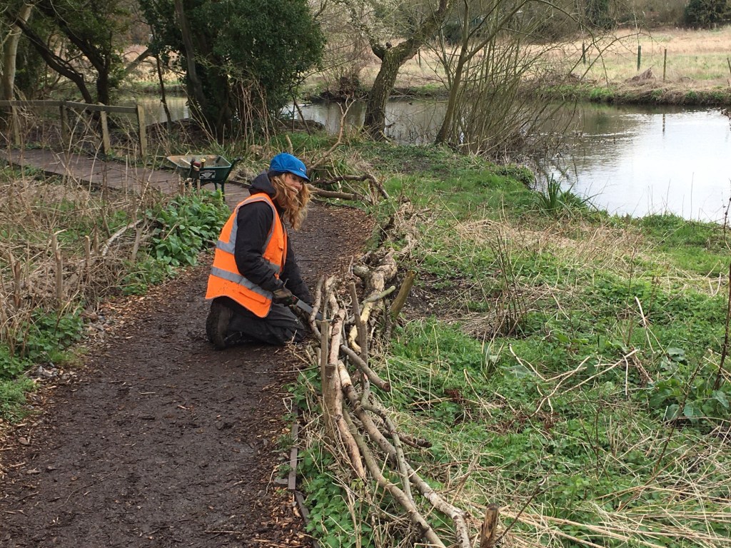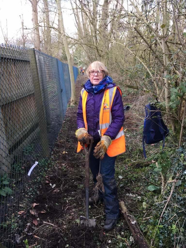 Today, February 27th, the day began with big wet snowflakes, but by afternoon all was sunny again. The work party in Paradise, led by Vic Smith (city ecologist), were doing great things – a very large spring-clean / litter-pick removed not only the visible and obvious, but delved into bushes, toured the woodland in the centre and came away with lots of bags of cans, bottles, rubbish and old sleeping bags. The main task, however, was to plant up the area beside the new back fence (you will have noticed the ugly old one has been replaced by new green plastic mesh). Beside it, there is now a new hedge of mixed native shrubs: field maple, sloe, guelder rose and hazel, which will bulk up and provide cover for birds. Finally, Vic restored the low willow fence protecting the butterbur beside the river. Many thanks to the volunteers for their help on a cold morning.