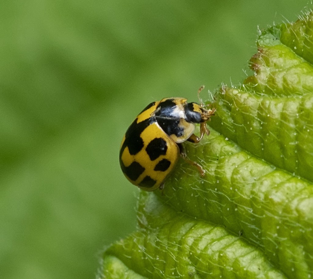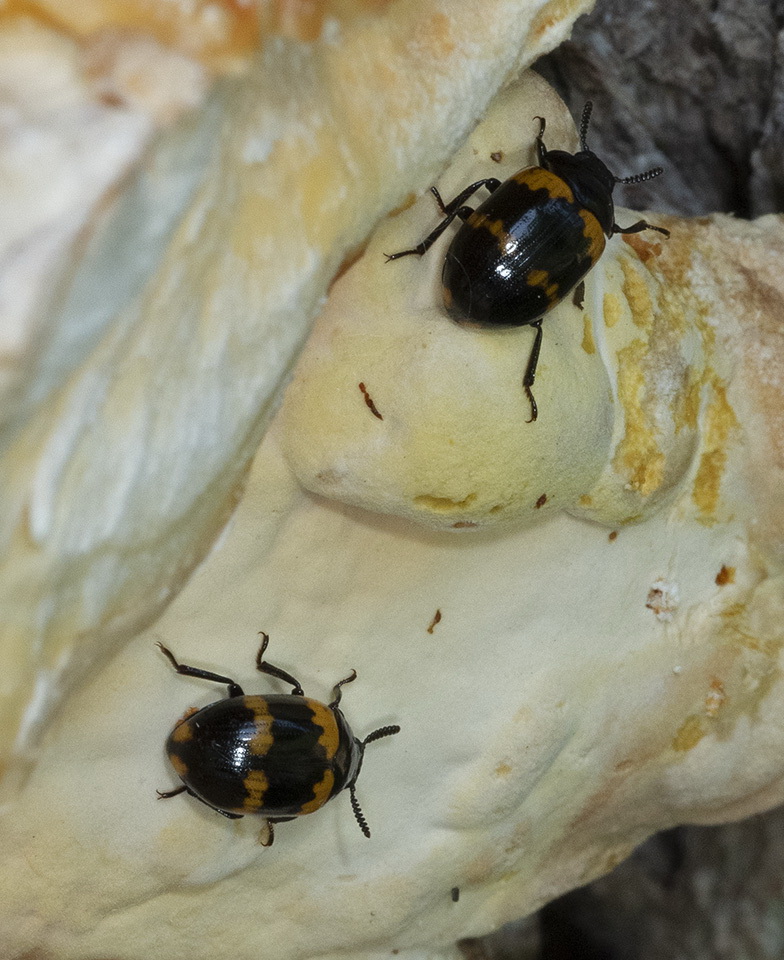 There is a new Chicken of the Woods Fungus on one of the big willow trees by the river, just where the little ‘bridge’ is. It has been attacked with a knife (perhaps by someone wanting some for eating!) but it is hosting a very large number of Fungus Beetles Diaperis boleti. These small beetles live on and in the fungus and disperse at night to find new growths.
