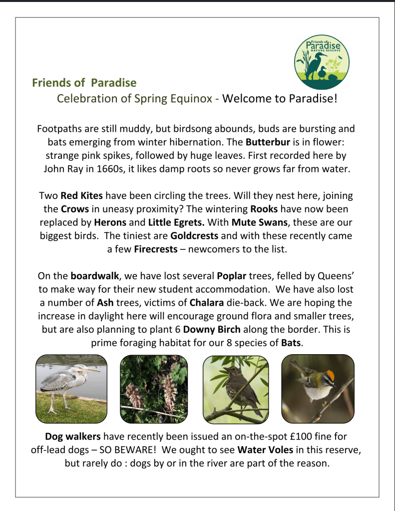 And do come along to Olwen’s talk about ‘Habitats and Wildlife in Newnham’ on TUESDAY 31 MARCH at 6PM — children welcome!